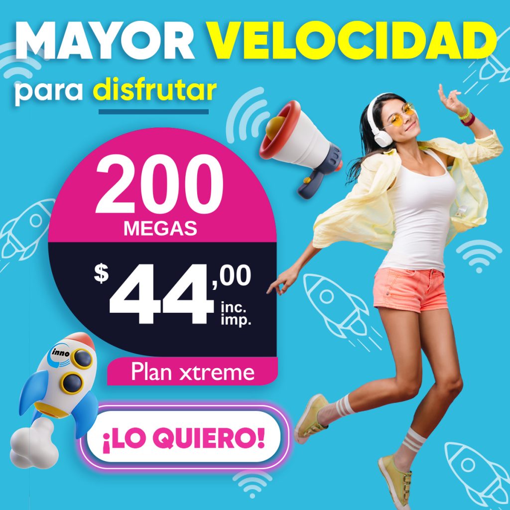 Inno es uno de los únicos proveedores de servicios de Internet que ofrece velocidades de carga y descarga iguales, lo cual es una gran ventaja cuando chateas por video, juegas y compartes archivos o imágenes de gran tamaño